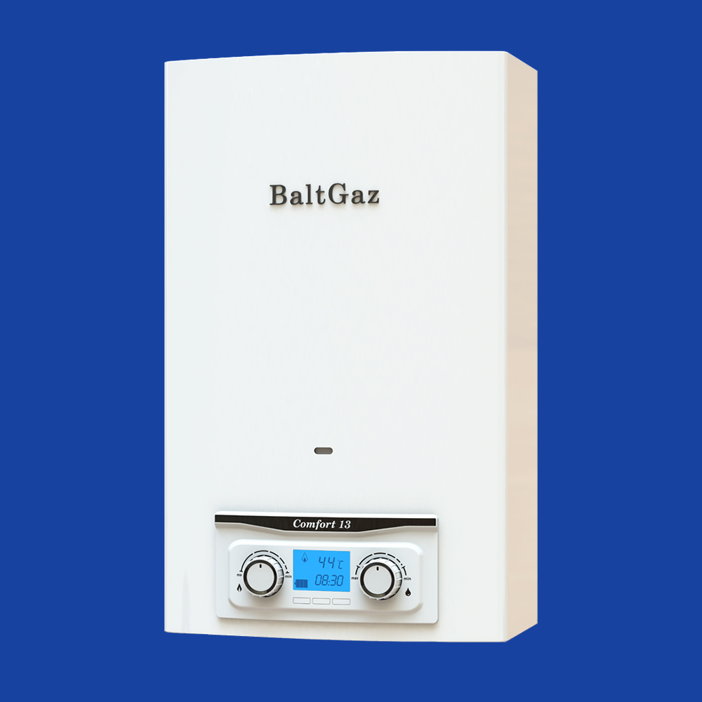 BaltGaz Comfort 13, из серии комфорт класса, изготовлен с учетом всех особенностей водоснабжения в России и странах СНГ, поэтому стабильно работает в условиях жесткой воды. Перед поступлением в продажу оборудование и его запасные части проходят испытания на прочность и безопасность.